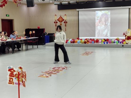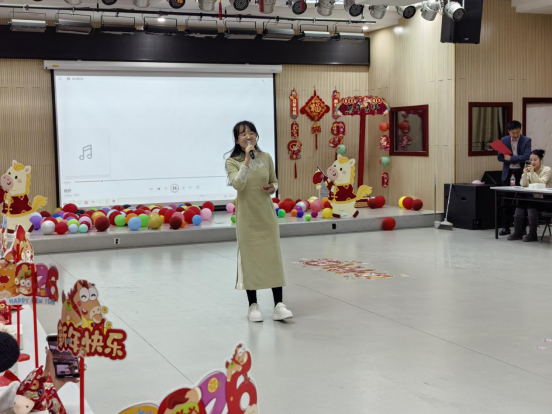 随着主持人张鹏、白凌子两位老师热情洋溢的开场,晚会节目精彩纷呈、形式丰富。韩宝禾小朋友表演的灯笼舞《过年啦》活泼可爱、年味十足;梁燕老师演唱的《夜空中最亮的星》深情动人,传递出理想与信念的力量;张子睿老师的单口相声《评书贯口——英雄赞》幽默风趣,引得现场笑声连连;王建利、熊学艺两位老师合唱的《精忠报国》气势恢宏,抒发了深厚的家国情怀;高英老师一曲《这世界那么多人》温暖真挚,唤起大家对相遇与缘分的珍惜;庄文老师和许颖老师带来的《七里香》旋律清新,为晚会增添了抒情色彩;青马班学员朱柯如的舞蹈《TikTok和桃花朵朵开》活力四射,展现了青马班学员的青春风采;魏爽老师演唱的《青柠》甜美动听,进一步营造了轻松欢快的现场氛围。